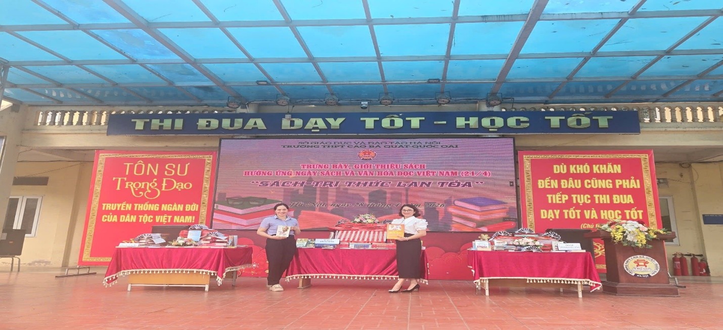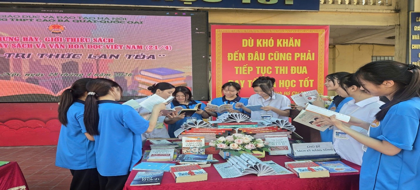 Thực hiện kế hoạch tổ chức các hoạt động hưởng ứng Ngày Sách và Văn hóa đọc Việt Nam, ngày 28/4/2026, Thư viện Trường THPT Cao Bá Quát-Quốc Oai đã triển khai hoạt động trưng bày, giới thiệu sách trong giờ ra chơi dành cho học sinh toàn trường. Hoạt động được tổ chức phù hợp với điều kiện thực tế của nhà trường, đảm bảo không ảnh hưởng đến thời gian học tập chính khóa của học sinh. Thay vì tổ chức tập trung, thư viện nhà trường đã bố trí các khu vực trưng bày sách tại sân trường và thư viện, tạo điều kiện để học sinh tiếp cận sách trong các khung giờ nghỉ giữa các tiết học.